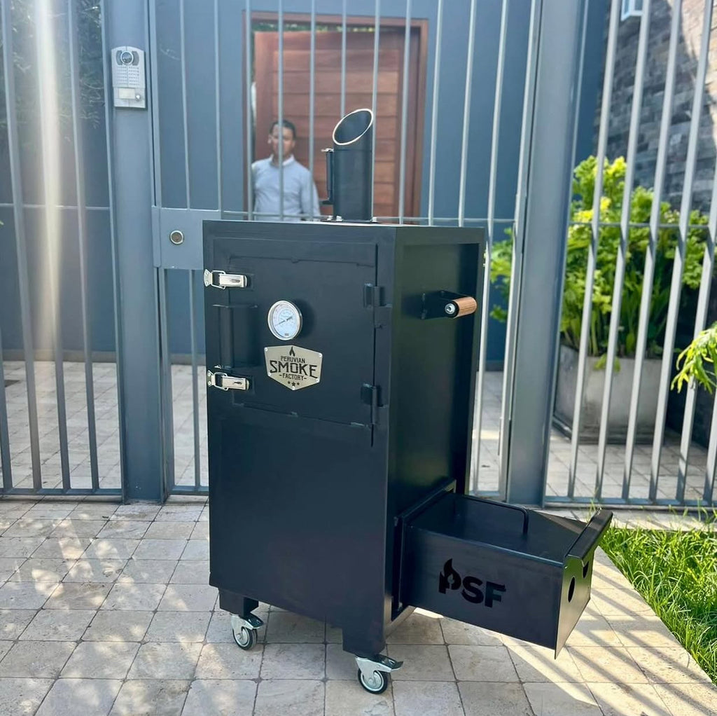 Nuestro Nina smoker es la evolución del cilindro convencional. y en esta nuevo modelo 2.0 cuenta con una puerta frontal y 3 bandejas de malla metalica rebatibles! Cuenta con una caja de fuego independiente, esta nos permite trabajar con la brasa dentro o fuera del cilindro. con la caja fuera del equipo, trabaja como un ahumador offset. Cuenta con una base para colgar los alimentos . Adicional a los 4 niveles, tenemos un nivel bajo para poder poner un reservorio con agua para poder mantener hidratados nuestros alimentos en la preparación! También incorporamos un reloj para poder medir la temperatura de nuestro equipo. Una chimenea regulable para poder controlar el flujo del humo.